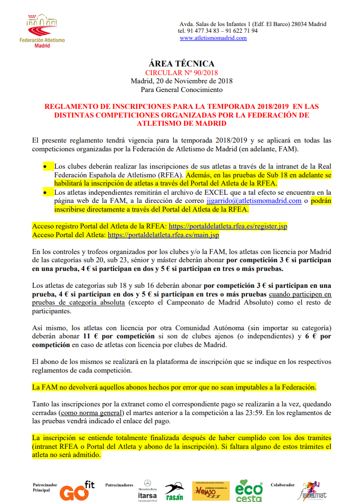 REGLAMENTO DE INSCRIPCIONES PARA LA TEMPORADA 2018/2019 EN LAS DISTINTAS COMPETICIONES ORGANIZADAS PRoberto Cortés21 nov 20181 Min. de lecturaOs compartimos el reglamento de inscripciones elaborado por la Federación de Atletismo de Madrid .